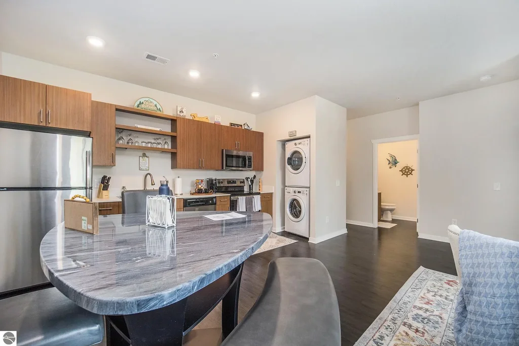 Fully furnished Month-To-Month 2 bedroom/2 bathroom condo in the heart of Traverse City. Condo is on the third floor and is right on the VASA Trail. Security deposit is one month of rent. Condo has in unit laundry and rent includes internet, electricity, trash, and water/sewer. A dog may be okay per landlord approval. Lease start July 1.