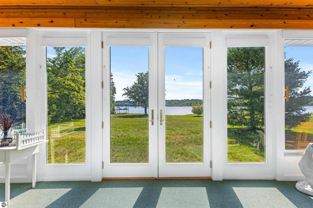 Offering high ceilings, open spaces and panoramic views of Lake Leelanau, this home was designed to accommodate all your friends and family for a holiday weekend or to enjoy the peace and quiet in a one person hammock on the expansive front lawn. The 103 feet of direct private waterfront boasts a hard sandy bottom perfect for building sandcastles or sitting in your favorite beach chair. Lake Leelanau was glacier made and is known for great water skiing, boating, walleye fishing and dinner destinations from SouthEnd Tiki to The Cove in Leland and everything in between. Want to get started enjoying Northern MI right away? The low hours boat, dock and hoist, could be included and are ready to be launched into the clear blue waters! The expansive 3 season sun porch overlooking the lake offers a glass wall to take in the amazing sunrise views and wraps you in warmth with a beautiful wood ceiling. The open concept living room features soaring ceilings with rustic beams and sweeping views of the lake from the kitchen and dining room. The split bedroom design offers a beautiful primary suite overlooking the water with a slider to the porch on the south side of the home and three additional bedrooms and full bath on the north end of the home. An additional third full bath is perfect for overflow and sandy feet. Conveniences and details such as vinyl siding, new well pump, 220 electric in the attached two car garage, newer Lennox furnace and air conditioning and an 8 year old roof and 18 year old septic system lead to more time on the water and less time working on the house. The additional detached 3 car garage is spacious enough for all your toys and is easy in and out with a cement floor and light and bright with electric and heating. Furnishings are negotiable. This could be your summer to live and LOVE in Northern MI!