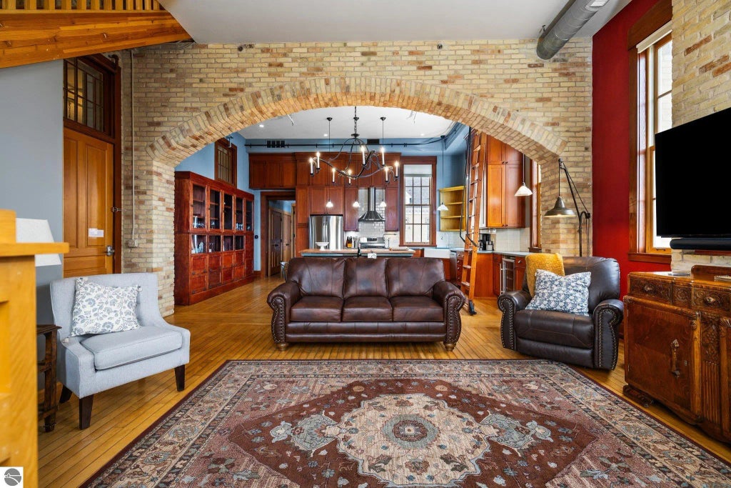 One of Grand Traverse Commons finest condos w/ plenty of character & functionality, in majestic historic main Building 50, facing the front yard. Open floor plan, maple flooring & 8 ft windows throughout main level. Living rm has some brick walls and stunning brick archway over dining room. Kitchen has cupboards to the top of the 13 ft ceiling accessed by a sliding library ladder, a large corner farm sink, slate counters & antique island. Stunning master suite/bath. The Village offers shopping, services, salons, yoga, pilates, restaurants, coffee shops, wineries & breweries. 380 acres of parkland surrounds the commons. Pets welcome. Short-term rentals allowed. Beaches, downtown TC 1 mile away.