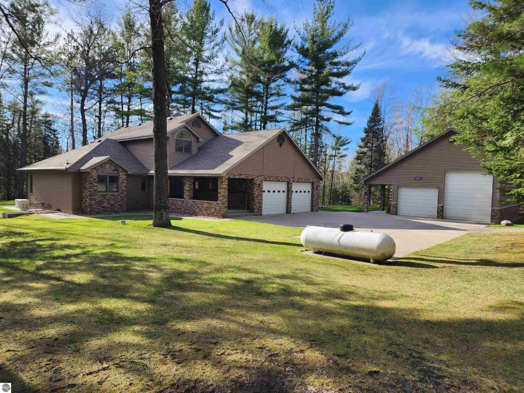 THE RIFLE RIVER AND 10.02 ACRES. This meticulously cared for one owner home is nestled amongst 10 wooded acres adjoining State Land with 245 ft of Rifle River frontage on a private road. The home boasts a stunning natural fireplace, ample storage, primary bedroom with his & hers walk-in closets and primary bathroom, along with numerous views of the outdoors from the dining room, living room, and primary bedroom. The spacious kitchen offers built-in appliances, a pantry, and an island. Other features include a 6 block crawl space, newer roof, custom blinds, attached heated 2 car garage, forced air propane furnace & pellet stove, central air, water filtration system, security system, covered porch, deck, and a Generac system. Upstairs there is plenty of space to add a potential third bedroom! The 40x32 Pole Building has insulated finished walls, forced air heat, workbench/bar, and a covered porch to enjoy watching the abundance of wildlife. This immaculate home and beautiful property offers a great mix of comfort, seclusion, storage, and quality!