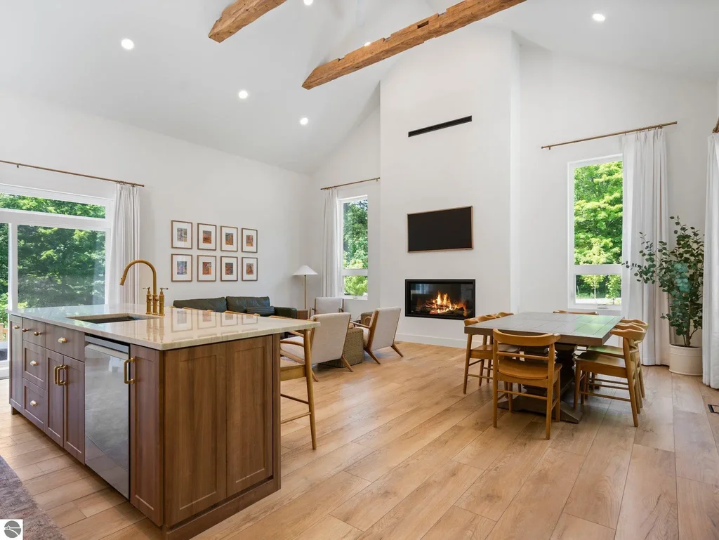 Featuring stunning Mykonos quartzite countertops, this 4-bedroom, 3-bath home offers 3,100 square feet of living space that blends modern elegance with comfortable functionality. The open-concept kitchen flows effortlessly into the main living area, where soaring vaulted ceilings are accented by white pine beams reclaimed from the 1800s - adding warmth, character, and a story to every gathering. The fully finished lower level expands the living space and includes a walkout basement that opens to a second patio - perfect for hosting guests or enjoying quiet evenings outdoors. Located just a short walk from South Lake Leelanau, owners have the option to join a private beach club or take advantage of the nearby public launch at Paradise Cove - ideal for sunny days on the water. Tucked into the woods, the property offers a sense of peaceful retreat while remaining just minutes from downtown Traverse City and the charming towns of Leland, Suttons Bay, and Glen Arbor. The setting combines quiet privacy with easy access to some of Leelanau County’s most beloved destinations. Whether you’re entertaining on the expansive upper patio, relaxing on the lower-level walkout, or simply unwinding in thoughtfully designed spaces, this home captures the perfect balance of seclusion, convenience, and timeless Northern Michigan charm.