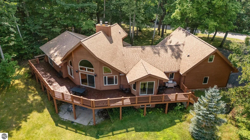 This home reflects a deep appreciation for quality and comfort while capturing panoramic views of the magnificently crafted Cedar River Golf Course. Positioned on the 7th fairway and pond is where you'll find this 3800+ square foot home. A beautifully crafted home with beamed cathedral ceilings in the living room, effortlessly blending the kitchen and dining areas, complemented by large windows showcasing stunning views of nature and the golf course. There are five bedrooms; three of which have private bathrooms. The roomy primary bedroom is on the main floor and includes an en-suite bathroom, several closets, private deck access, and is conveniently situated next to a den that can be easily transformed into an office, if desired. The second bedroom is located on the opposite side of the main floor, while three additional bedrooms are situated on the lower level. Downstairs is a family room with gas fireplace, 3 bedrooms; 2 of which are ensuites, plus an adorable space waiting to be converted into a game station or reading nook. The outside deck offers entertaining space with views to captivate you all day long. Additional amenities include an attached three-car garage with extra space above the garage, large foyer entrance, spacious dedicated storage room, plenty of storage throughout, and stunning hard wood flooring. Summer or winter, you are a short drive to the ski hills or the pro shop. This bright and clean home was built to last and is located at Shanty Creek Resort in Bellaire, Michigan. Showings to begin 8/18/25.