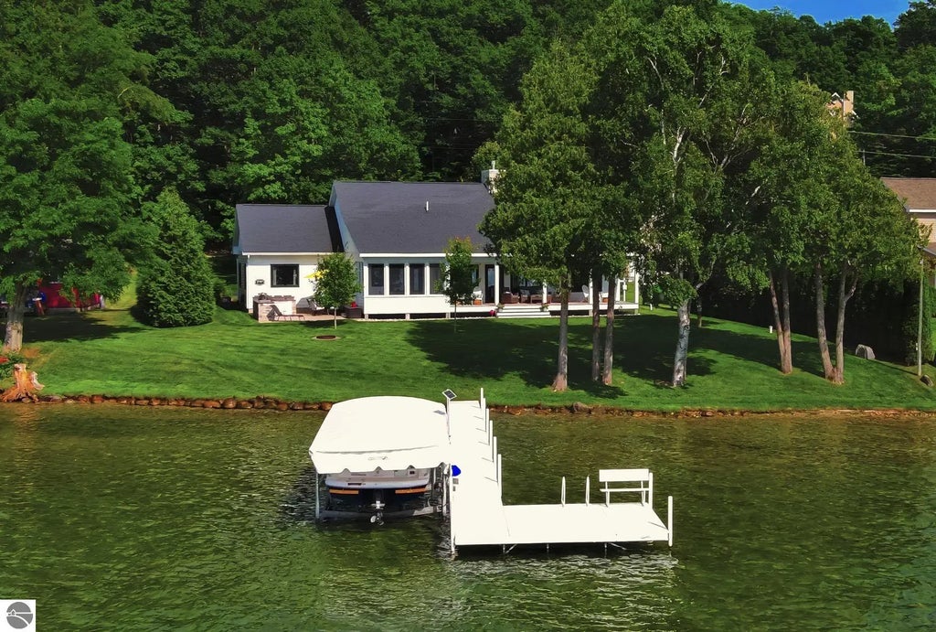 Immaculate in every way, this 2016-built lakefront home offers unmatched attention to detail in a peaceful, private setting with westerly sunset views over South Lake Leelanau. Set on 110 ft of pristine shoreline, the property is professionally landscaped with irrigation and drip systems complemented by a large covered porch with mahogany decking and a screened-in porch for all-season enjoyment. A custom Napoleon outdoor kitchen with granite countertops, stone veneer, grill, side burner, and refrigerator makes outdoor gatherings effortless while a Brock dock system with a solar-powered 4,500 lb shore station (2021) completes the lakeside amenities. Inside, the open-concept design with 9 ft ceilings creates a natural flow for hosting. The chef’s kitchen is the centerpiece, featuring a 9 ft quartz island, stainless steel appliances, double ovens, custom Nowak cabinetry, and a large walk-in pantry—perfect for dinner parties, group cooking, or casual entertaining. The great room, anchored by a natural stone fireplace, offers inviting warmth and seamless connection to the kitchen and dining areas, while the screened porch expands living space into the outdoors. The primary suite includes a walk-in closet and spa-inspired bath with dual sinks and a large walk-in shower, while two additional guest rooms are enhanced with natural lamb’s wool carpet and custom window treatments. A non-conforming bunkroom designed to sleep four adds a fun element for guests or children, and a dedicated office and well-equipped laundry room provide everyday functionality. Mechanical highlights include a fully conditioned and encapsulated four-foot crawl space, dual water softeners, a 50 gal water heater, and closed-cell foam insulation. The insulated and heated garage, EPS whole-home security system, and additional detached storage shed further elevate convenience. Located on a quiet private drive minutes from TC & the surrounding recreation, amenities, and small towns of Leelanau.