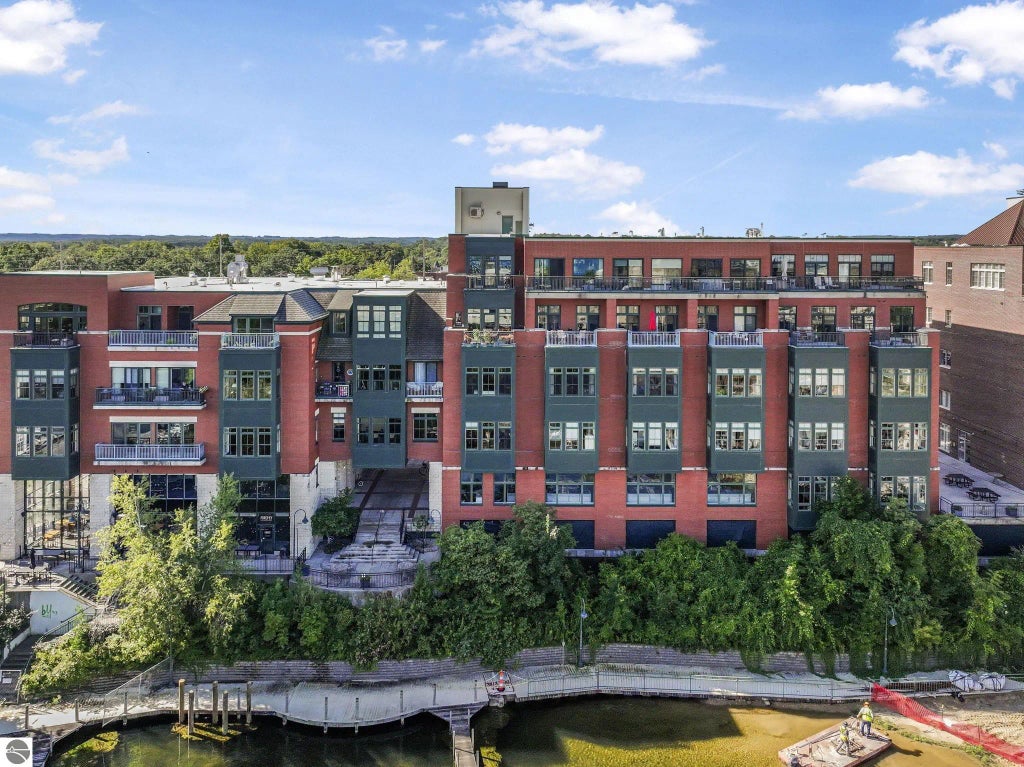 One bedroom and one bath condominium in the heart of downtown Traverse City located at Rivers Edge. This condo boasts nearly 1,200 square feet of open living space, large windows allowing for lots of natural light, a cozy gas fireplace, Boardman River frontage, spacious kitchen, an underground parking space, and maintenance-free living. Enjoy Traverse City's downtown dining, shopping, and entertainment right out your front door of this high end condo development.