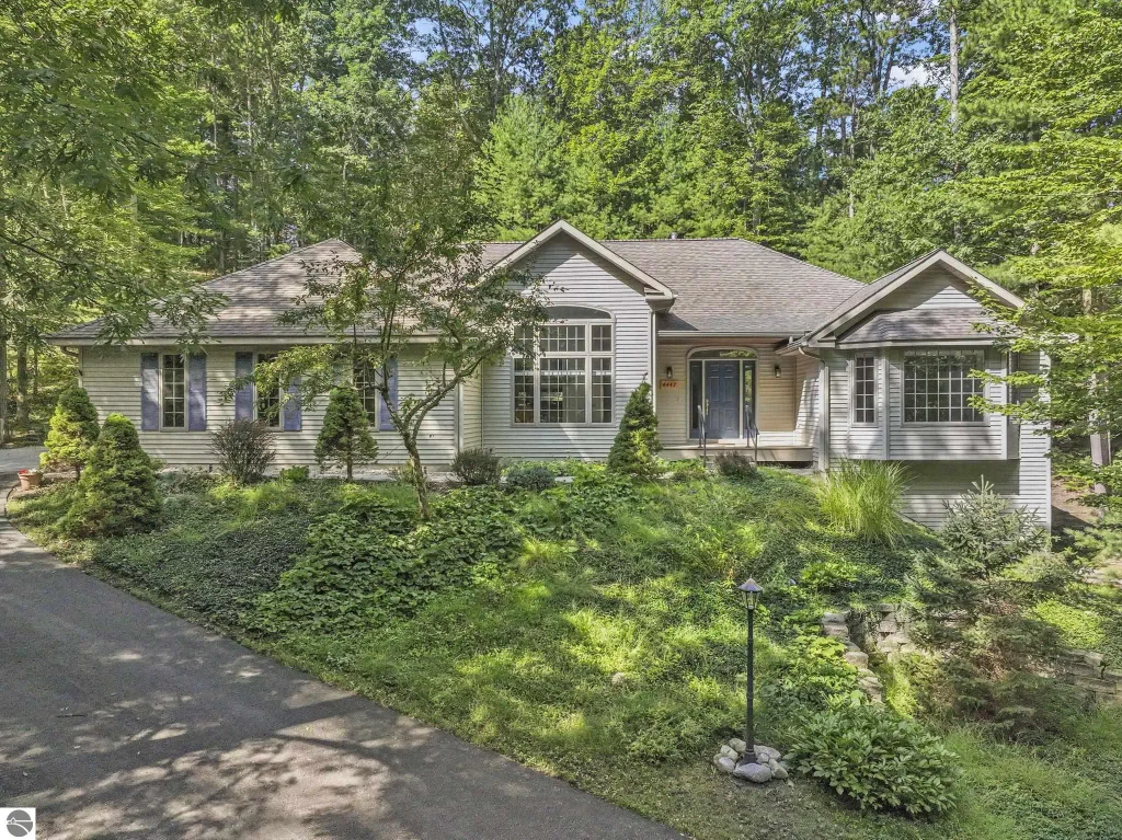 This stunning home spares no detail! Spacious home features 3 bedrooms, 2 baths, Main floor living conveniences, natural gas fireplace accents the gracious living room, large island kitchen layout with breakfast nook and access to rear covered deck, Granite c/tops, pantry and wood floors. Primary suite with walk-in closet and well-appointed bath including Jacuzzi tub and tiled walk-in shower. Main floor laundry room and family/den room. Full unfinished walk-out lower level with daylight window, 9 ft. ceiling and plumbed for bath. Attached 2 car garage. Attention to detail inside and out with lovely grounds and mature trees provide your own private oasis. Easy access to Vasa trail, Tart trail and Mt. Holiday and beaches close by.