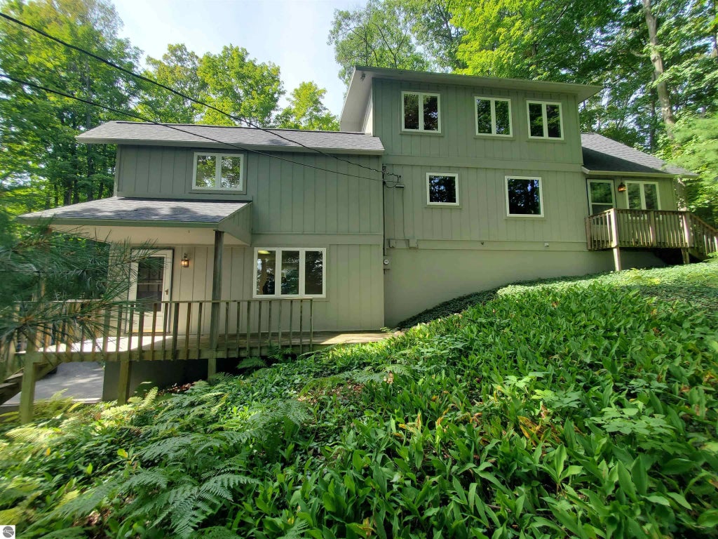 Seize every sunrise from your Hilltop Chateau. A totally elevated oasis with Treetop level views of West Grand Traverse Bay. You'll appreciate the sanctuary feeling of this 4.83 Acre private location along M22. All the best features of Leelanau are here within minutes for your enjoyment~ Boughey Park and Beach, Public Access sites to the waters of West Bay and Lake Leelanau, The TART trail, Wineries, Dining, Suttons Bay Beaches & Marinas, and of course a short drive to Traverse City. Centrally located to everything Northern Michigan is known for! Casual and earthy with oak planked floors, a natural stone wood fireplace and 2 bedroom loft~ this peaceful home whispers 1970's as it flows from floor to floor with features such as custom crafted wood 'Z' Barn Doors, spacious bathroom, a ground level studio or den with wood stove surrounded by real stone~ and mesmerizing wooded views from every window! Featuring several Casual Outdoor Deck Spaces, it's Truly a secluded paradise - This home is also primed as a potential income property or use the included separate 2.36 acre lot [already surveyed] to build for the future. Wherever your heart is taking you for your next home or vacation destination, consider this unique opportunity to own your piece of beautiful Leelanau County on Scenic M22!~ It's Okay to Fall in Love with a Place.