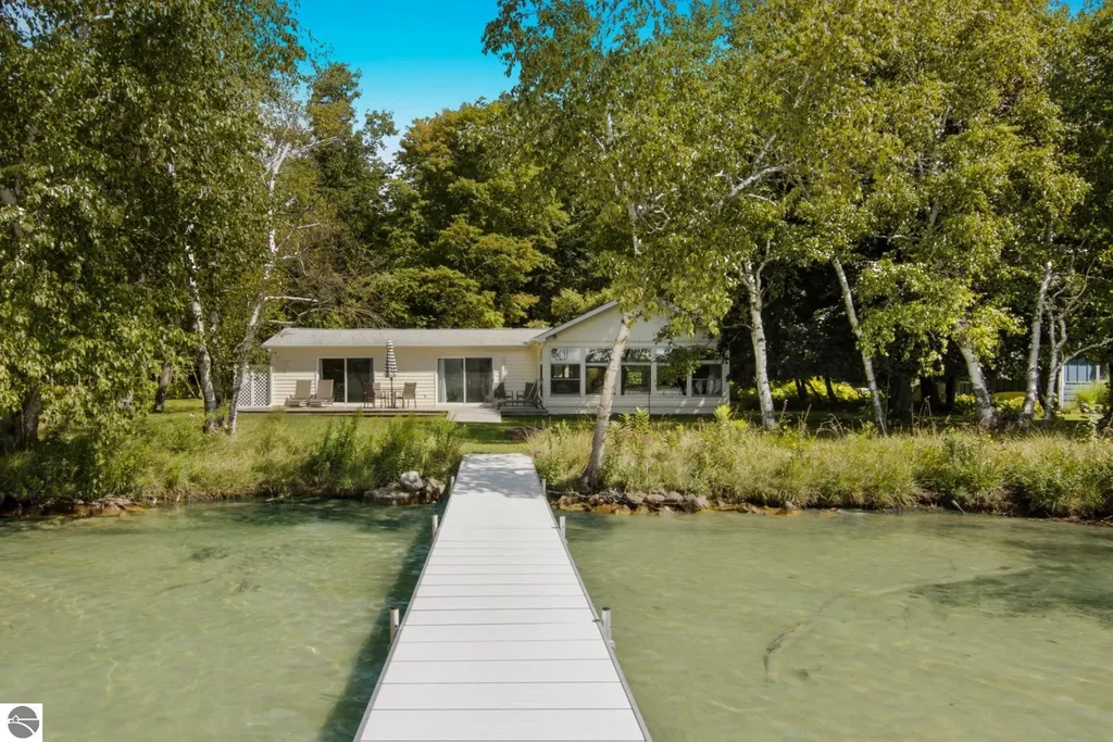 193 feet of private, sandy waterfront on Little Glen Lake sets the stage for this rare generational property. Nestled on 2.23 acres, an extraordinary amount of land for a waterfront parcel in this area. This home offers panoramic views of one of Northern Michigan’s most iconic lakes and is ready for its next chapter. The main house offers 1,540 sq ft of open-concept living, designed to maximize natural light and showcase water views from nearly every room. Two spacious bedrooms each feature large sliding doors, offering direct access to the deck and stunning lakefront vistas. Mini splits are strategically placed in both bedrooms and the family room for those extra hot summer days! For guests or extended family, the 775 sq ft bunkhouse includes a kitchenette, ¾ bathroom, and accommodations for six. There is plenty of space for storage and your toys as there is a 24x36 three-car garage, a separate 29x24 workshop, and even an exterior bathroom with a shower, perfect for rinsing off after a day in the lake. All furniture and items on the property will convey with the sale, including the dock and a wooden kayak launch raft that makes getting in and out of the water a breeze! Ideally located just five minutes from the village of Glen Arbor and with easy access to the Sleeping Bear Dunes National Lakeshore, biking and hiking trails, and the region’s wineries, this property offers a rare blend of privacy, acreage, and convenience. Whether enjoyed as a legacy family retreat, vacation getaway, or investment opportunity, this is Northern Michigan lake living at its finest.