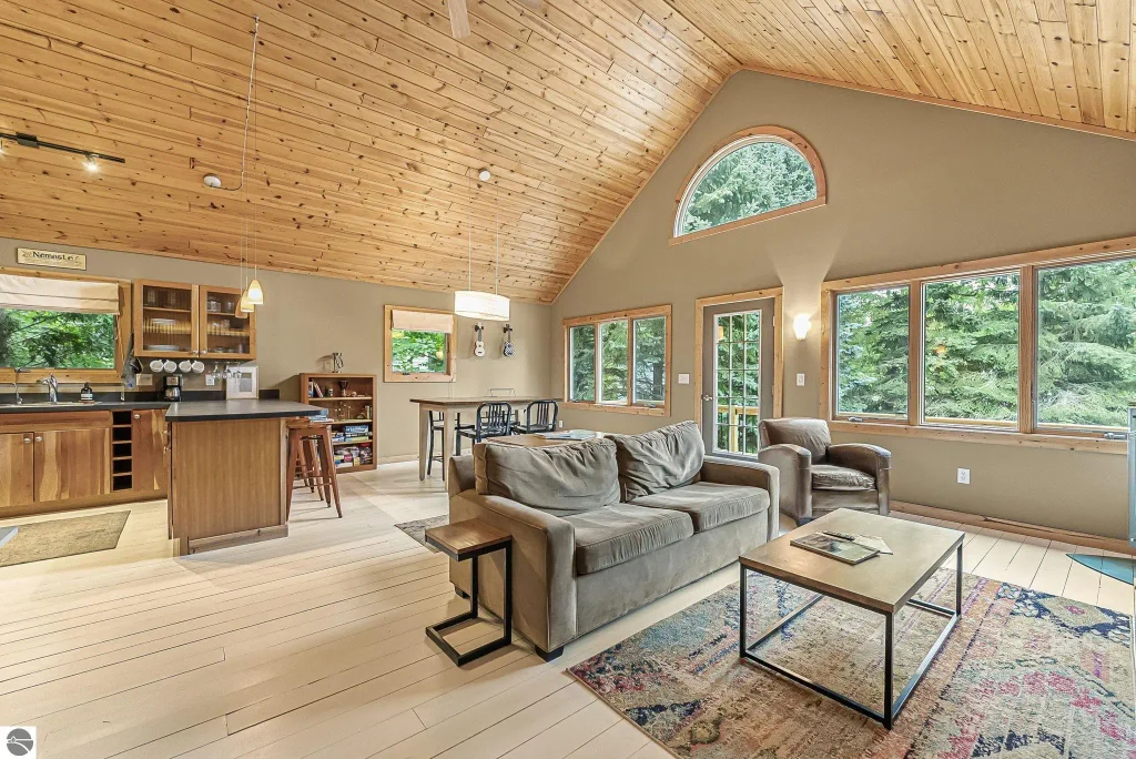 Enjoy living in downtown Leland! This inviting bi-level home offers a fantastic low-maintenance option for a seasonal lifestyle, while delivering full functionality and the comfort needed for year-round residency in Northern Michigan. Tucked away off the main road and accessed via a quiet alley, this home is nestled within a shady, wooded setting. Entirely above grade, this home has the feel of an elevated treehouse with beautiful greenery visible through every window and door. Cherry kitchen cabinets, painted wood flooring, pine tongue and groove finishes, and an earthy color palette add warmth and rustic charm to the interior. Upstairs, the main living area features an open-concept layout under vaulted ceilings with an arched, clerestory window. The kitchen, dining area, and living room flow seamlessly together, opening onto a sunny, south-facing deck with a retractable awning—perfect for outdoor entertaining, evening cocktails, or morning coffee. Also on the upper level is the spacious primary bedroom, complete with a walk-in closet and access to a shared full bathroom. This primary bedroom enjoys soft northern light and overlooks the private backyard. The lower level offers three additional bedrooms, two bathrooms, and a laundry room, all connected by a central hallway with ample storage. Two of the three bedrooms on this level open onto outdoor patios, and the laundry room includes an exterior entrance with a pet door - use this as your mudroom! - an ideal entry after sandy beach days or snowy adventures. Other features include a freestanding natural gas stove in the living room, radiant heat on the main floor, plus forced air and AC throughout. Whether you're looking for a full-time residence or a short-term rental, this home has broad appeal. Just a few blocks from access to North Lake Leelanau and the heart of Leland’s shops, restaurants, and attractions, this is a chance to establish your foothold in town, finally!
