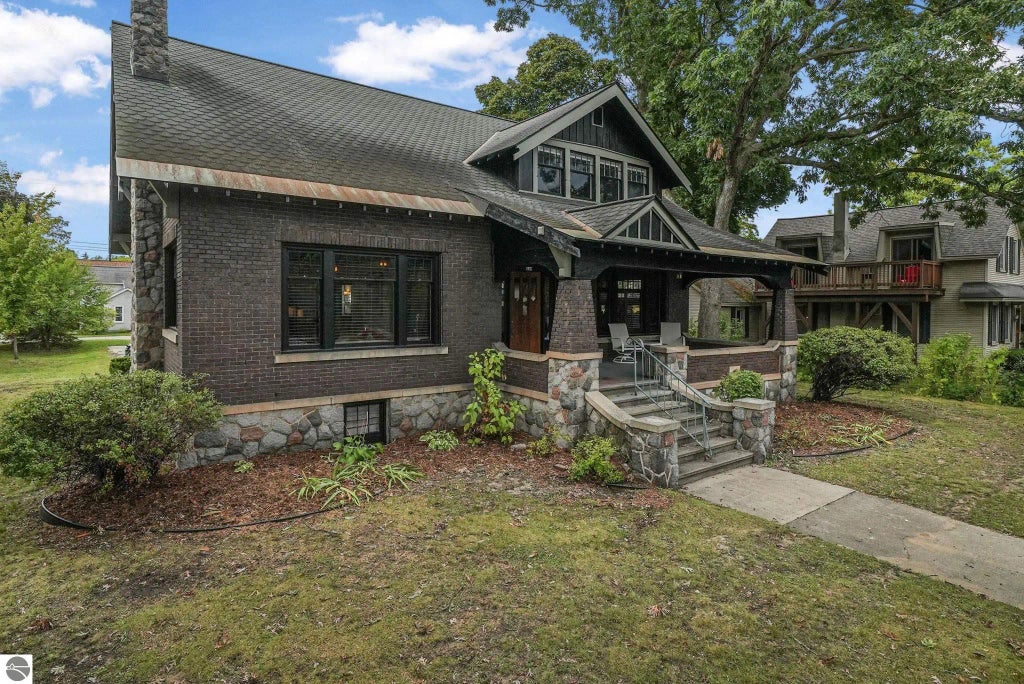 This is one of the most iconic Traverse City structures, and now one of the coolest ownership opportunities of a historic mixed-use property on the corner of 9th and Union Street - large enough to be split by right! This historic Old Town bungalow built in 1915 was constructed with high end craftsmanship and is beautifully preserved - find gorgeous maple hardwood floors, rich original wood trim, and striking 9' coffered ceilings. A grand wood-burning fireplace anchors the spacious living area, complemented by a welcoming foyer, den, office, and main floor primary bedroom. The main floor is currently used as an office, with lots of potential to go easily back to a residence. Upstairs could be a completely separate unit, as it has an additional kitchen, and two or three bedrooms with a private entrance. The finished lower level area adds valuable, flexible living/office space—perfect for a media room, home gym, expanded office use, storage, etc. Sitting on three city lots, the property includes a massive 2+ car garage with an oversized door—large enough to potentially fit four vehicles or provide RV/Boat storage. The setting is one of its finest attributes, with a covered front porch to take in the morning sun, or a lovely back patio area and large corner property on the alley to stretch out and enjoy. Big mature trees line the edges of the property as well - it's a must see!
