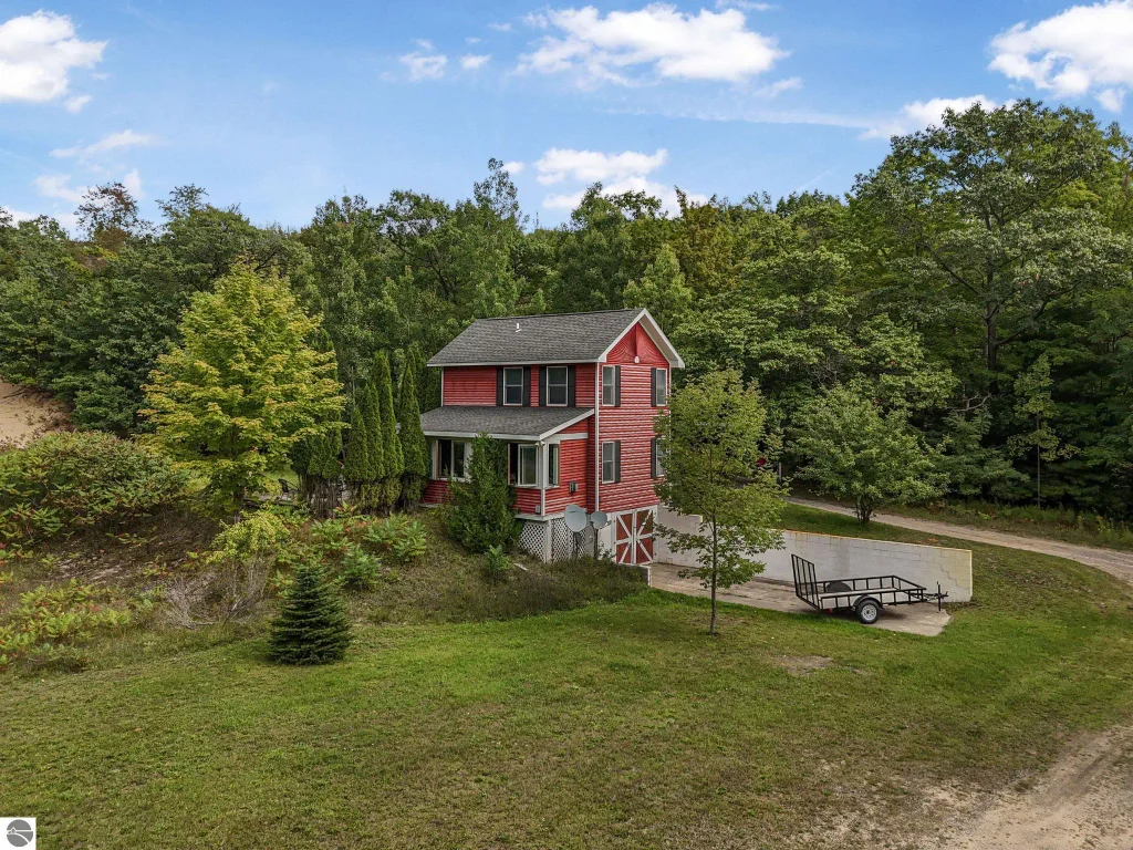 Presenting a unique, elevated farmhouse on 3 acres, just north of Leland! This simple, 1 bedroom / 1.5 bathroom residence is perched at the edge of a beautiful dune-like clearing, and is accessed via shared driveway easement off of scenic M22. The kitchen, living room with fireplace, dining area, and half bathroom are located on the main floor, which opens to a private deck - a delightful location to enjoy views of the yard and take in the sounds of nearby Lake Michigan. Upstairs, the primary bedroom has a vaulted ceiling, clad in wood tongue and groove paneling. This space is bright and cheerful, featuring numerous windows with views of the surrounding dune and woods. A full bathroom and walk-in closet with washer and dryer complete this upper floor. On the lowest level, a workshop and storage area walkout to grade through wooden barn doors. This home is a cosmetic fixer-upper with excellent bones and endless potential, just waiting for your personal touch and updates. Don’t miss your chance to live near beautiful Leland! Full associated documents include an inspection report.